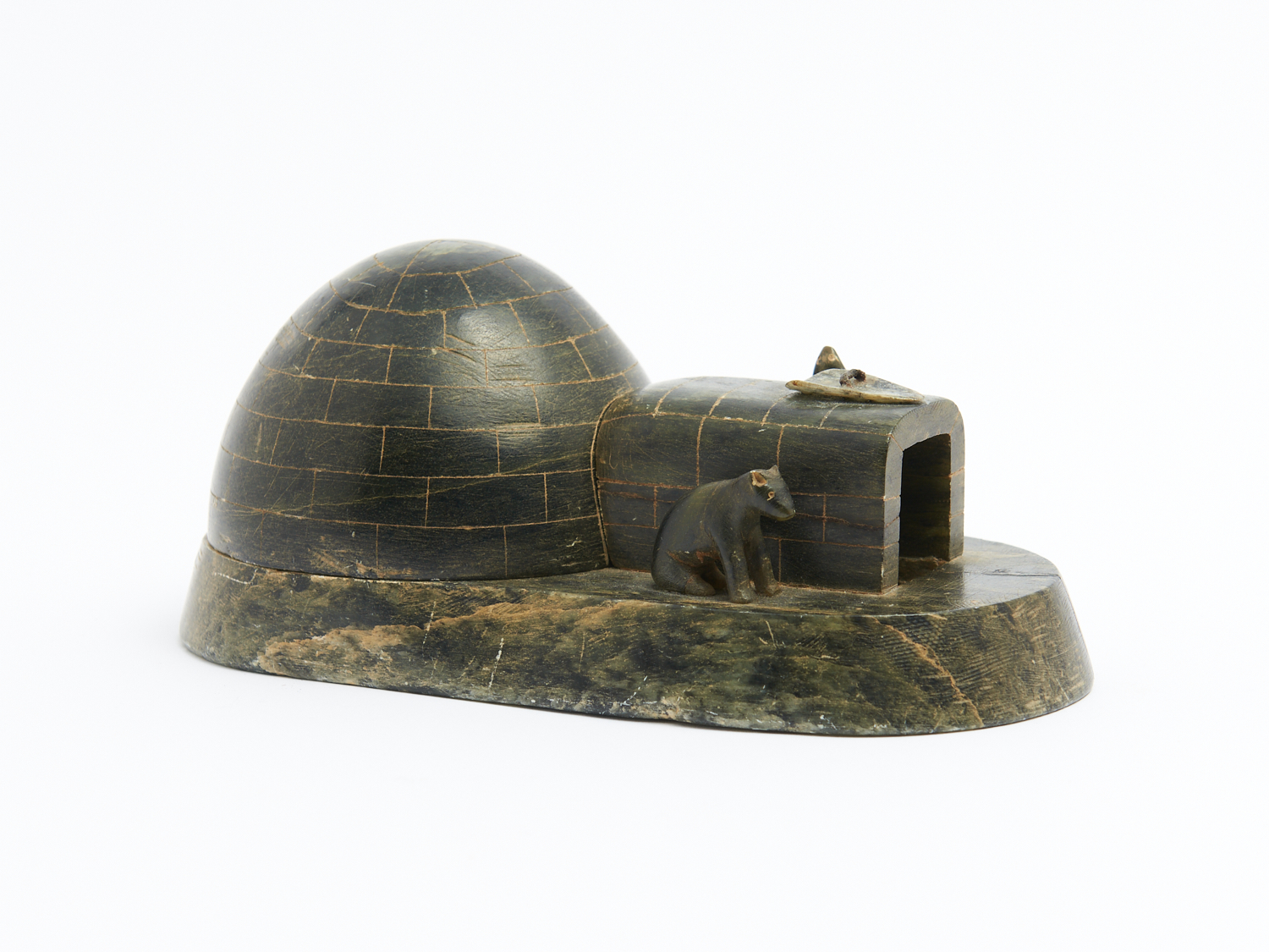 A CARVED STONE INUIT IGLOO WITH REMOVEABLE TOP SHOWING INHABITANTS L.19CM, LEONARD JOEL DELIVERY SIZE: SMALL