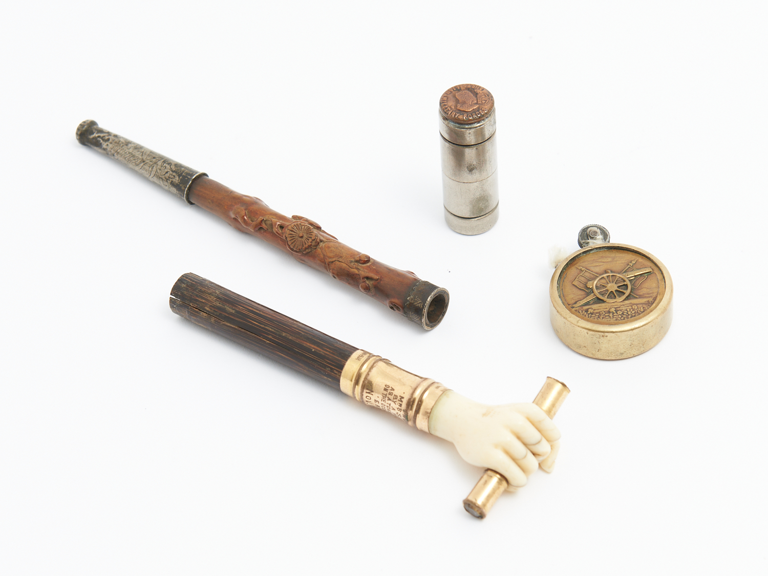 A GENTLEMEN FINDINGS GROUP INCLUDING TWO LIGHTERS, CARVED WOODEN PIPE AND A SMALL GAVEL L.15CM (LONGEST), LEONARD JOEL DELIVERY SIZE: SMALL