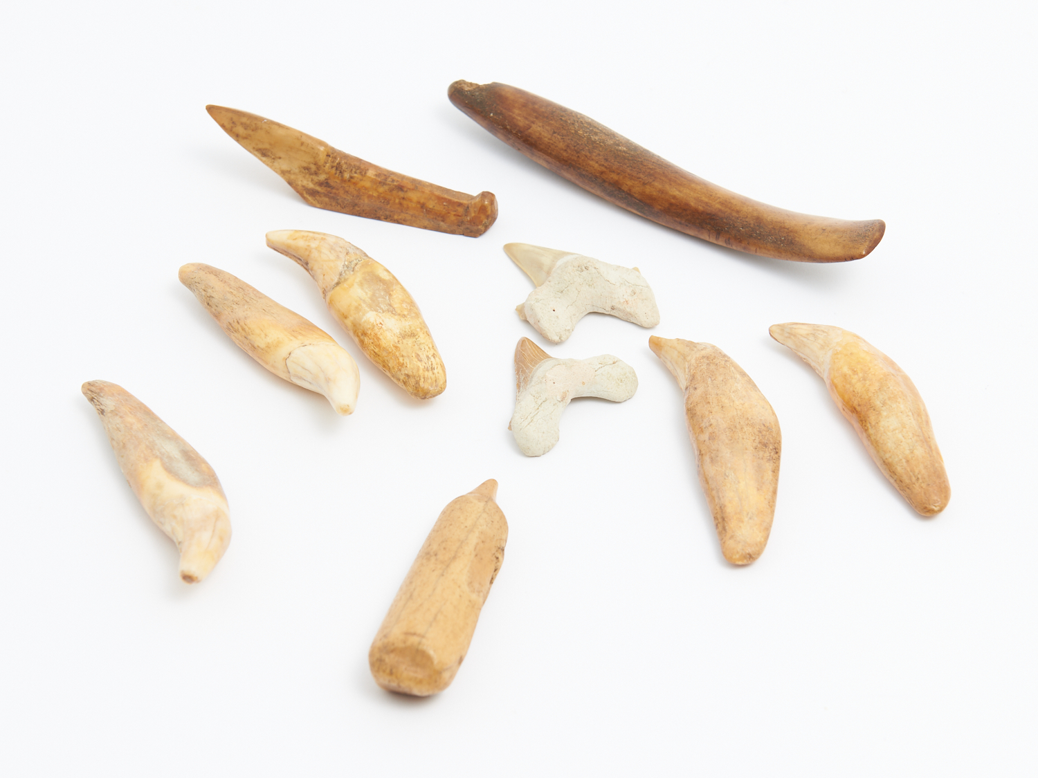 A GROUP OF EIGHT VARIOUS MARINE ANIMAL TEETH L.16.5CM (LONGEST), LEONARD JOEL DELIVERY SIZE: SMALL
