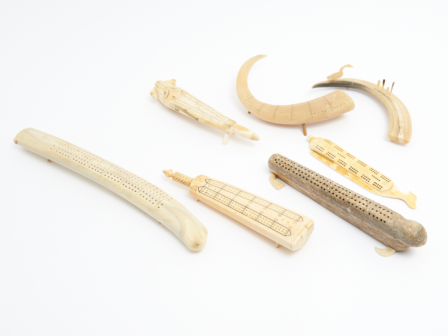 SEVEN CARVED BONE, HORN, TUSK AND MARINE BONE CRIBBAGE BOARDS L.36.5CM, LEONARD JOEL DELIVERY SIZE: MEDIUM