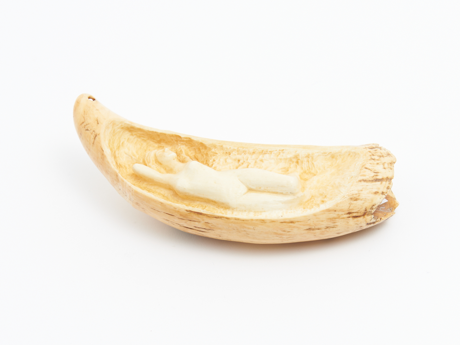 A CARVED AND ENGRAVED SCRIMSHAW WHALES TOOTH PRESENTED TO JAMES KELLY BY THE WHALING CLUB HOBART TOWN WITH DEEPLY CARVED FIGURE OF A NUDE WOMAN L.17CM, LEONARD JOEL DELIVERY SIZE: SMALL