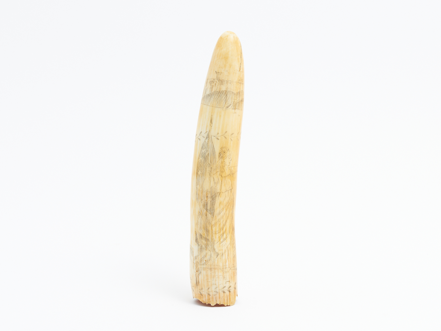 A 19TH CENTURY ENGRAVED SCRIMSHAW WHALES TOOTH DEPICTING THE FRENCH NAVIGATOR LOUIS-ANTOINE DE BOUGAINVILLE L.16.5CM, sm