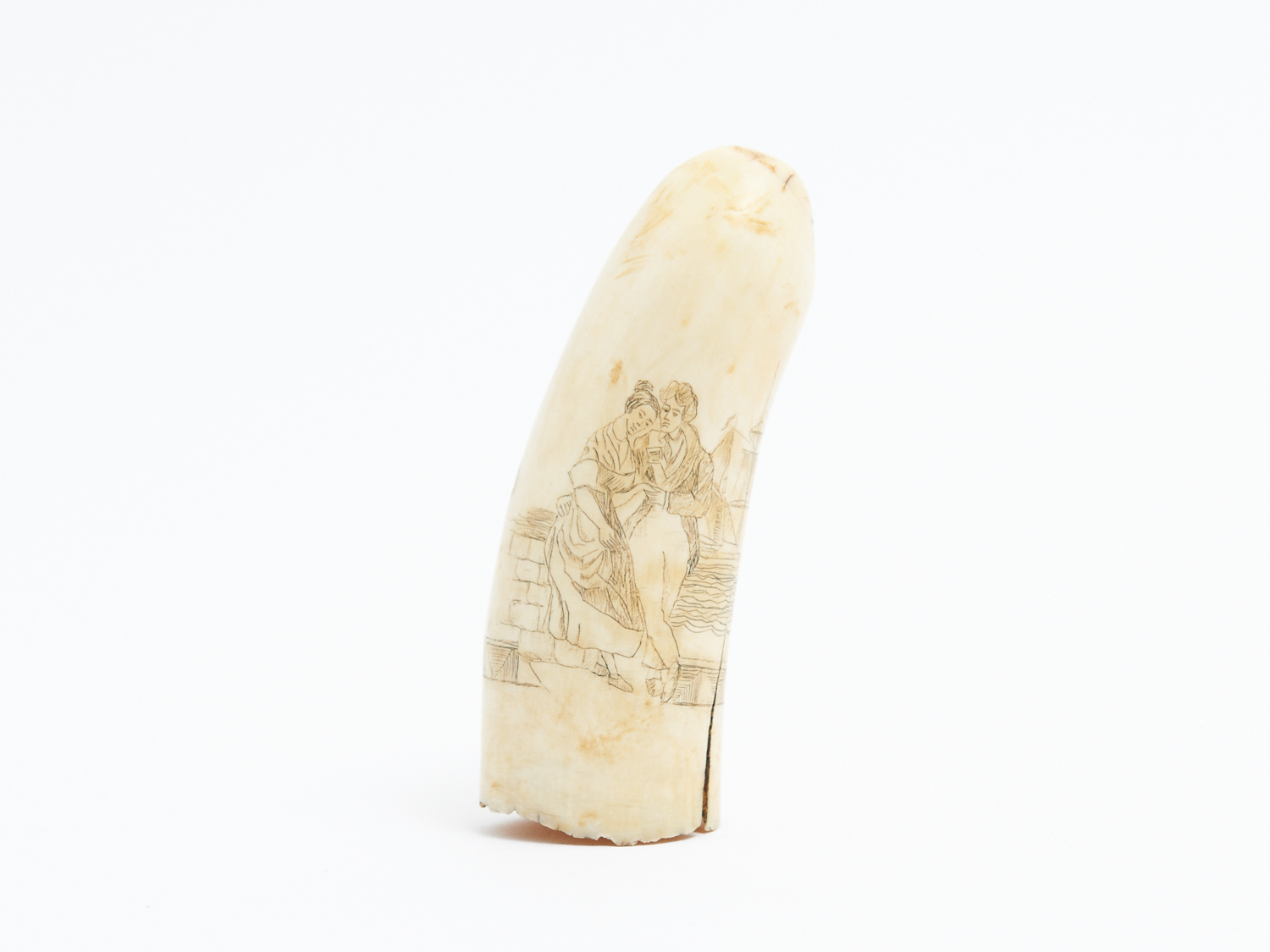 A 19TH CENTURY SCRIMSHAW WHALES TOOTH WITH A COUPLE EMBRACING BEFORE SHIP AND THISTLE L.12.5CM, LEONARD JOEL DELIVERY SIZE: SMALL