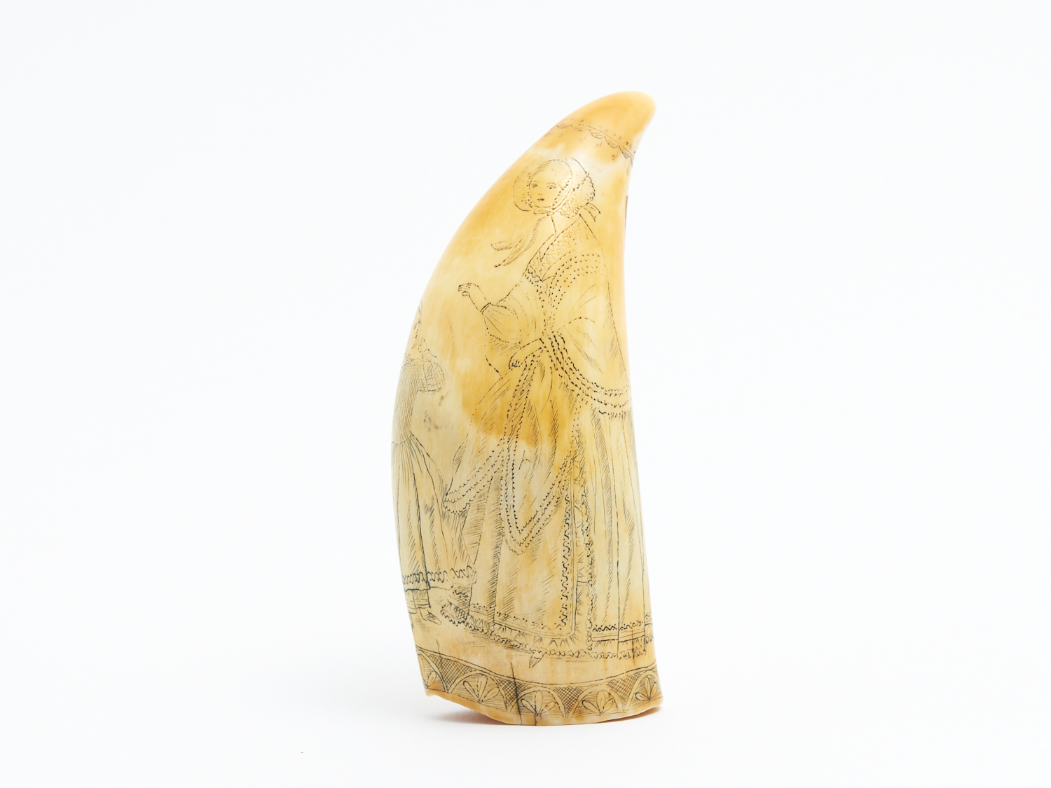 A 19TH CENTURY ENGRAVED SCRIMSHAW WHALES TOOTH DEPICTING THE FRENCH NAVIGATOR LOUIS-ANTOINE DE BOUGAINVILLE L.16.5CM, sm