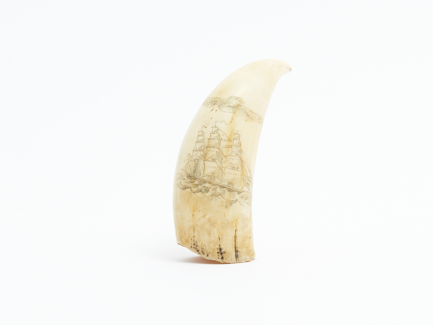 AN ENGRAVED SCRIMSHAW WHALES TOOTH WITH SHIP AND COMPASS DECORATION L.12CM, LEONARD JOEL DELIVERY SIZE: SMALL