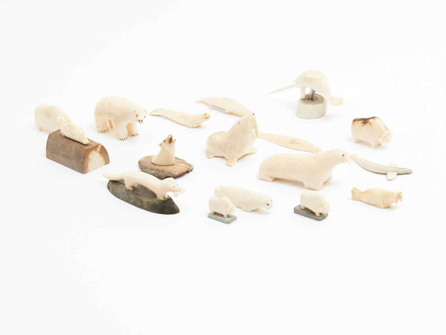 A GROUP OF SEVENTEEN INUIT CARVED MARINE BONE ARCTIC ANIMALS INCLUDING SEALS, POLAR BEAR, WALRUS, MUSK OX AND ERMINE L.10CM (LONGEST), LEONARD JOEL DELIVERY SIZE: MEDIUM
