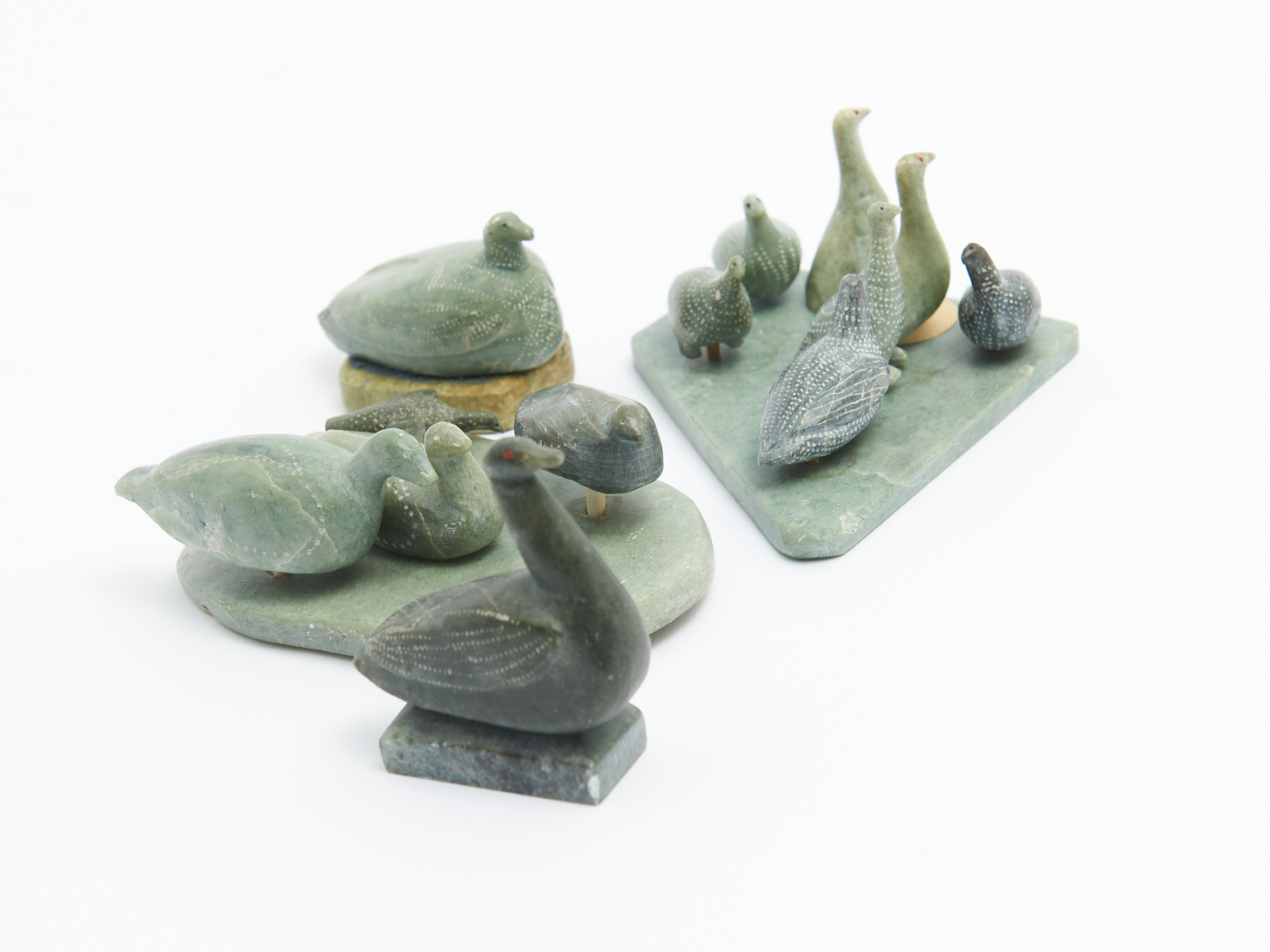 A GROUP OF GREEN STONE INUIT CARVINGS OF BIRDS H.6.5CM (TALLEST), LEONARD JOEL DELIVERY SIZE: SMALL
