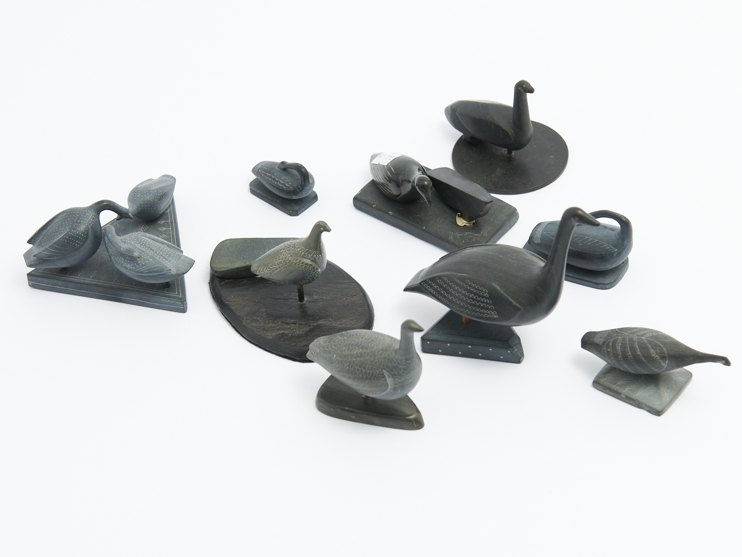 A GROUP OF DARK STONE CARVED INTUIT BIRDS (A/F) H.10.5CM (TALLEST), LEONARD JOEL DELIVERY SIZE: SMALL