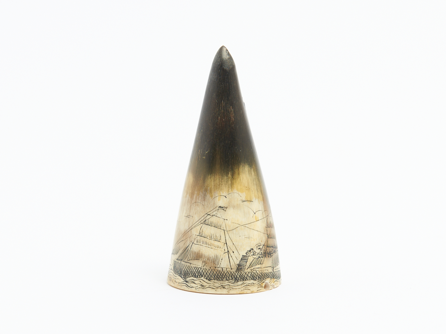 A SMALL POWDER HORN WITH CARVED SHIPS H.8.5CM, LEONARD JOEL DELIVERY SIZE: SMALL