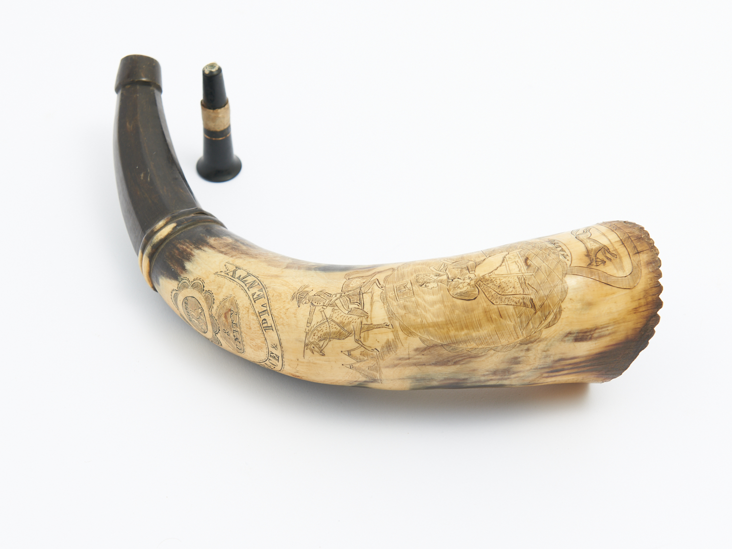 AN AUSTRALIAN COLONIAL ENGRAVED POWDER HORN WITH TURNED WOODEN CAP, DECORATED WITH A MAP, COMPASS AND SCENE OF CONSTITUTION DOCK,...