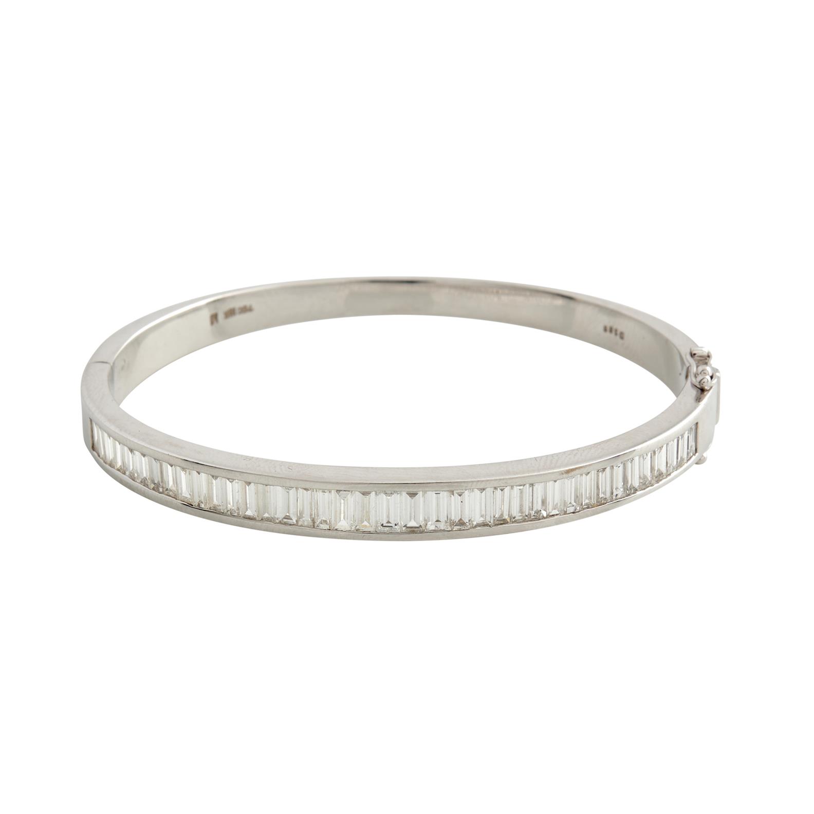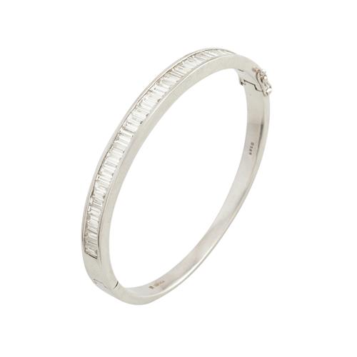 The hinged oval bangle, channel-set with baguette-cut diamonds together weighing approximately 3.89 carats, inner circumference approximately 170mm, gross weight 27.7 grams.