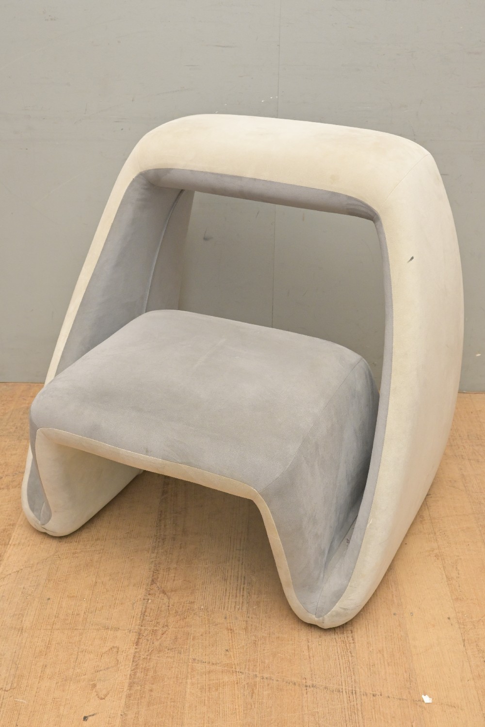 A CONTEMPORARY GREY UPHOLSTERED CHAIR (A/F) (8H X 86W X 78D CM) (LEONARD JOEL DELIVERY SIZE: X-LARGE)