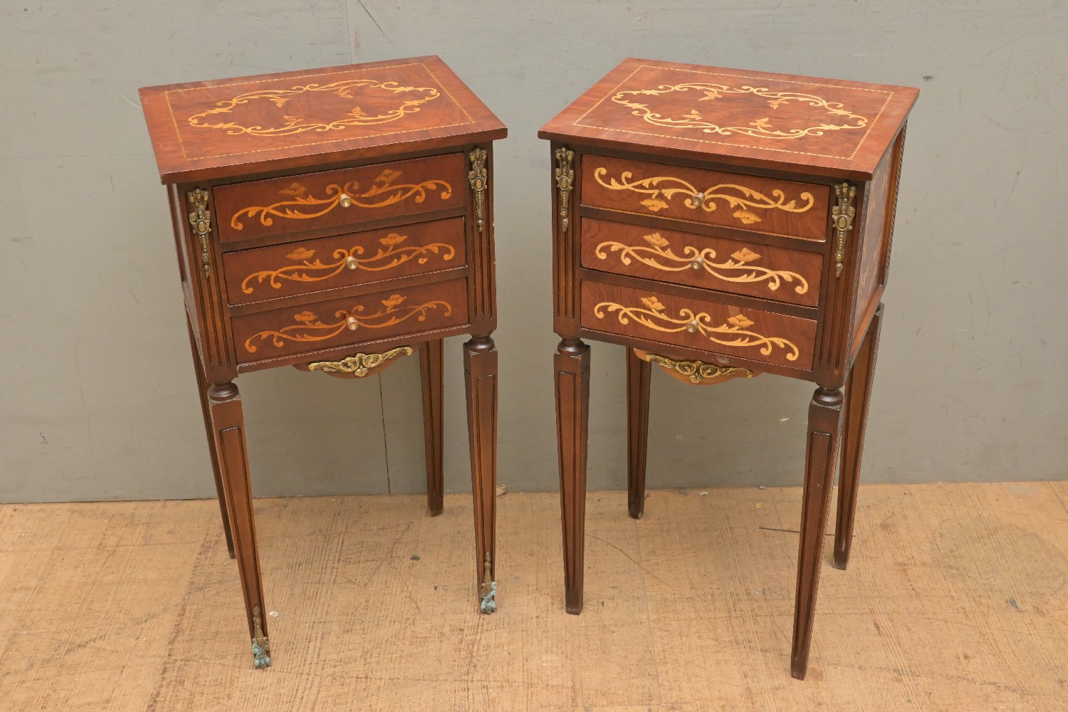 A PAIR OF SMALL LOUIS XVI-STYLE INLAID SIDE TABLES (A/F) (69H X 36W X 29D CM) (LEONARD JOEL DELIVERY SIZE: X-LARGE)
