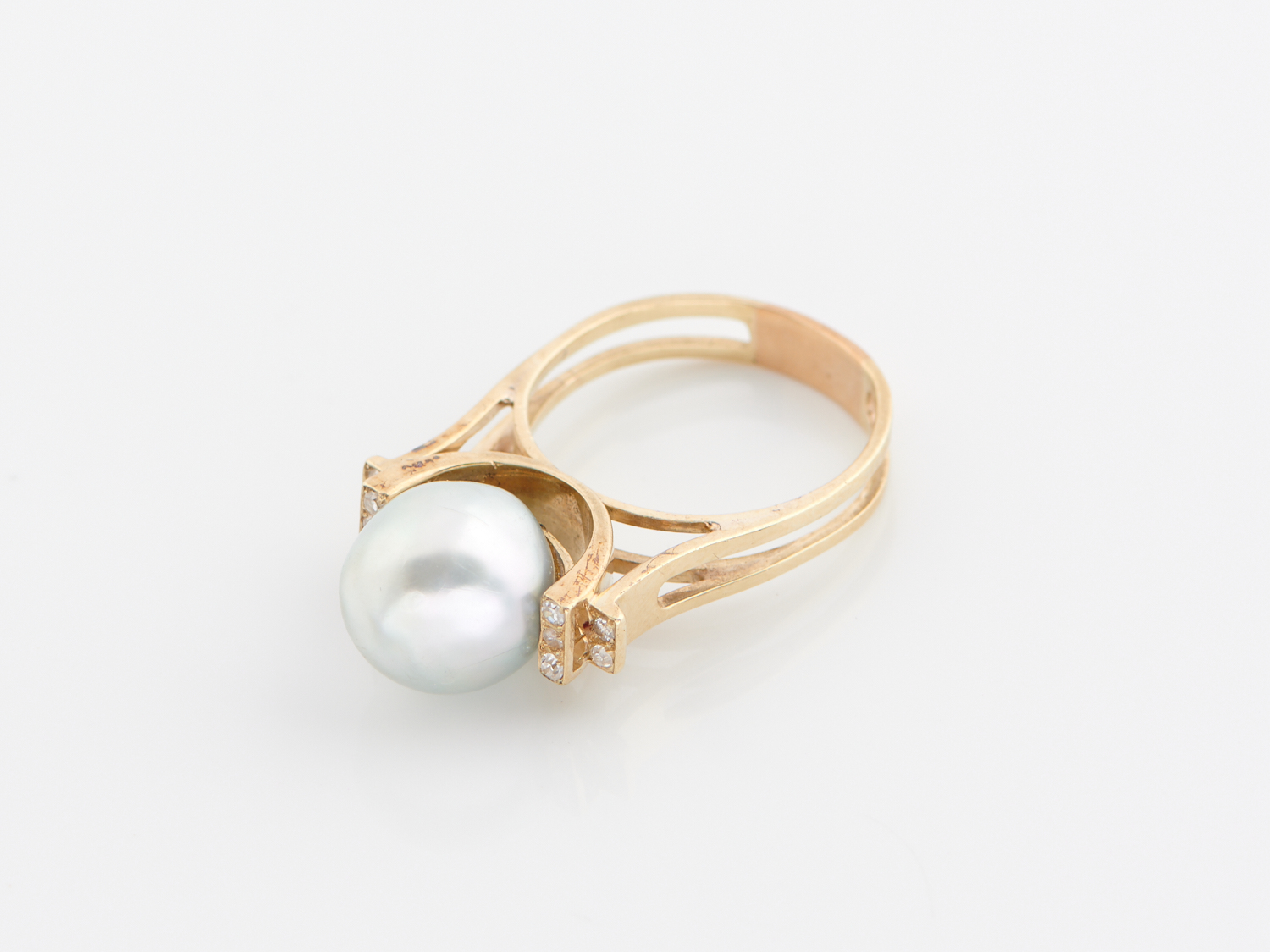 A PEARL AND DIAMOND SET RING IN 9CT GOLD, SIZE P, 8.7GMS