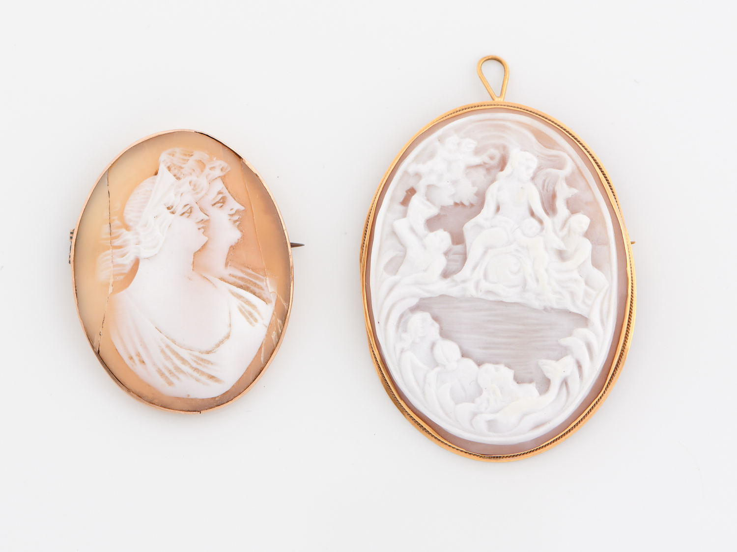 TWO CAMEO BROOCHES, MOUNTED IN GOLD PLATE, MEASURING 55 X 40MM AND 40 X 30MM, A/F