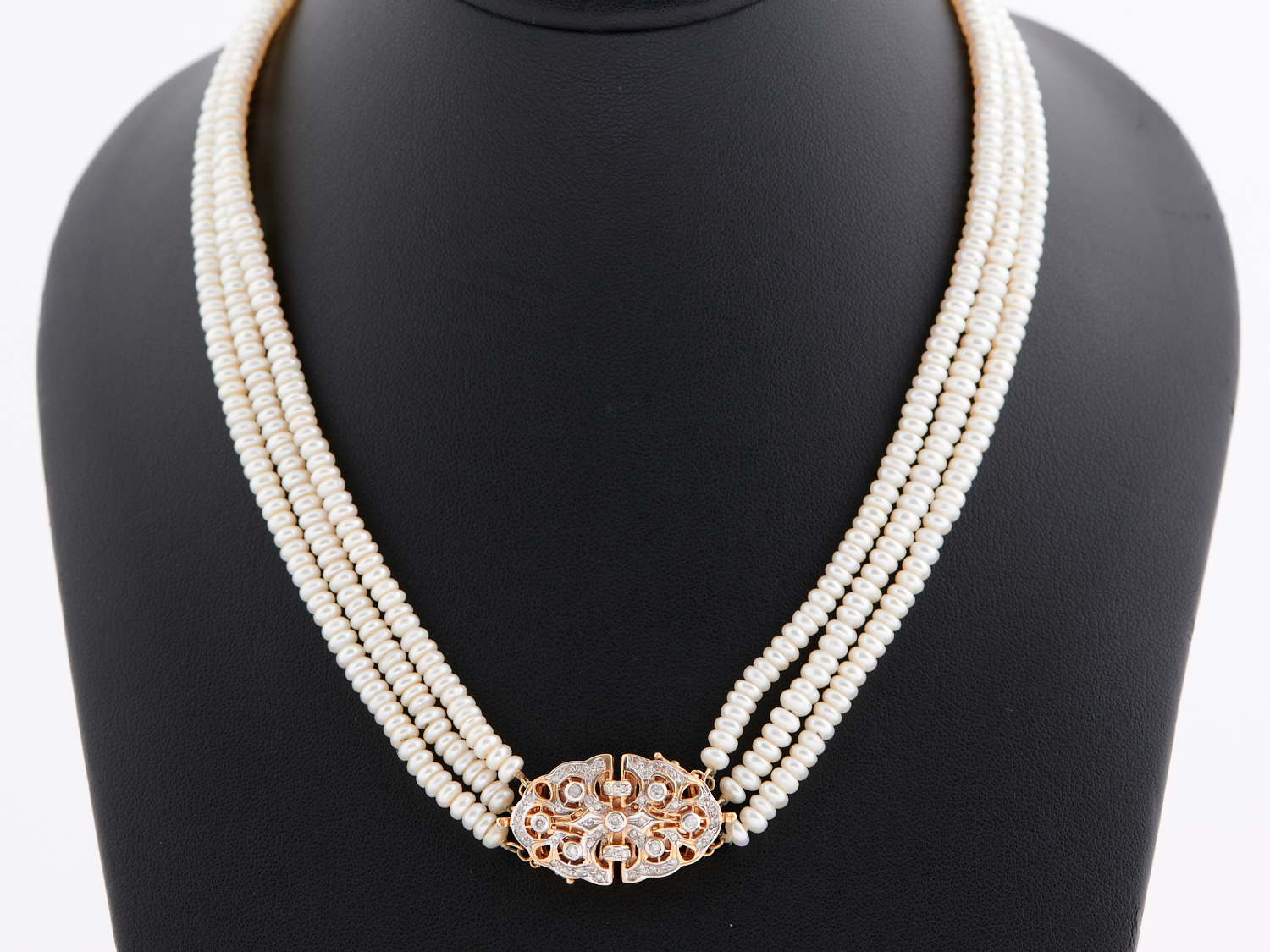 A TRIPLE STRAND OF FRESH WATER PEARLS TO A DIAMOND CLASP IN 14CT GOLD, APPOXIMATELY 420MM