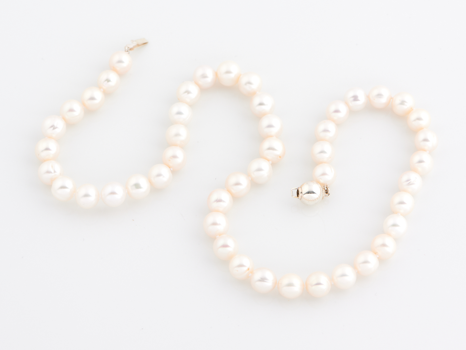A STRAND OF WHITE FRESH WATER PEARLS TO A CLASP IN STERLING SILVER, 500MM