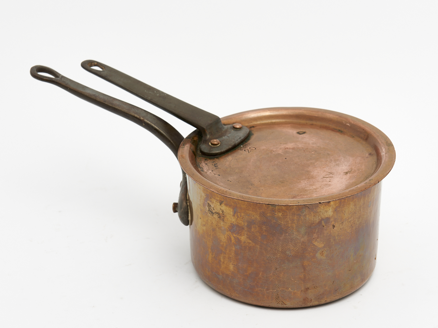 A 19TH CENTURY FRENCH COPPER CAST-IRON HANDLED AND LIDDED SAUCEPAN SIGNED POMMIER BRUXELLES DIA.21CM, LEONARD JOEL DELIVERY SIZE: MEDIUM