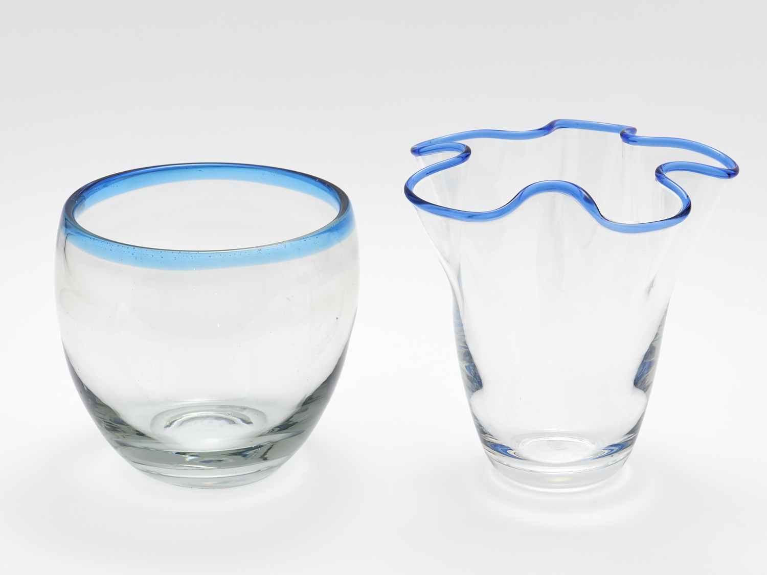 TWO BLUE AND CLEAR HEAVY GLASS VASES H.22.5CM (TALLEST), LEONARD JOEL DELIVERY SIZE: LARGE