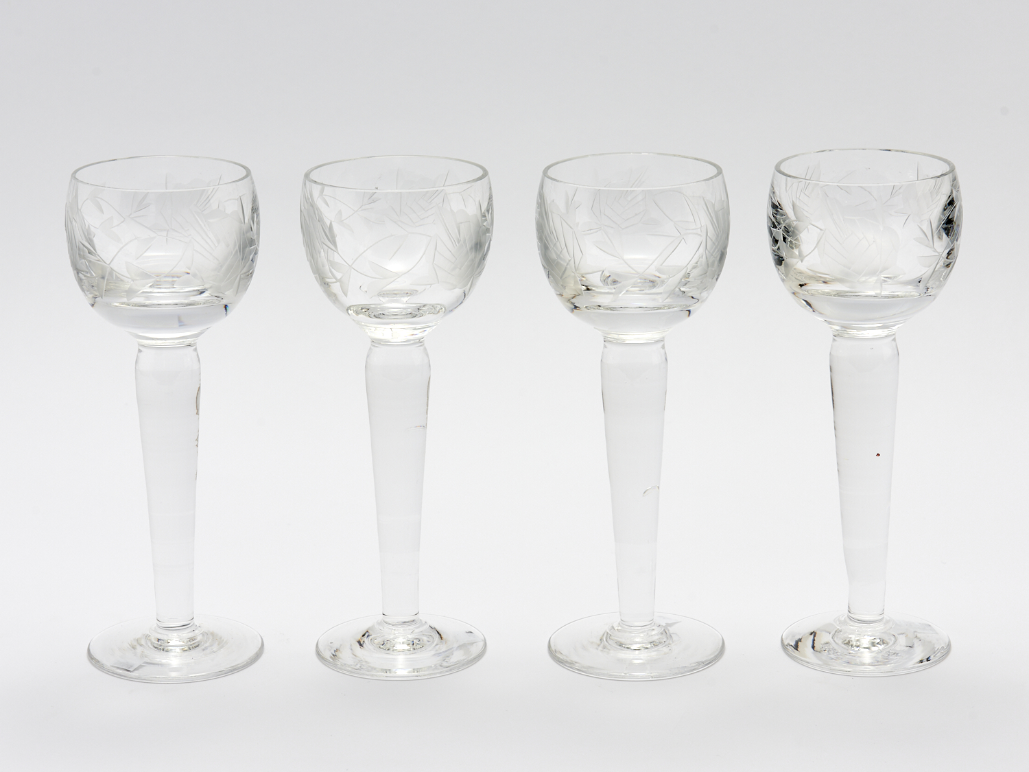 A SET OF FOUR VINTAGE 1984 SIGNED AUSTRALIAN ETCHED GLASS WINE GLASSES H.20CM, LEONARD JOEL DELIVERY SIZE: LARGE