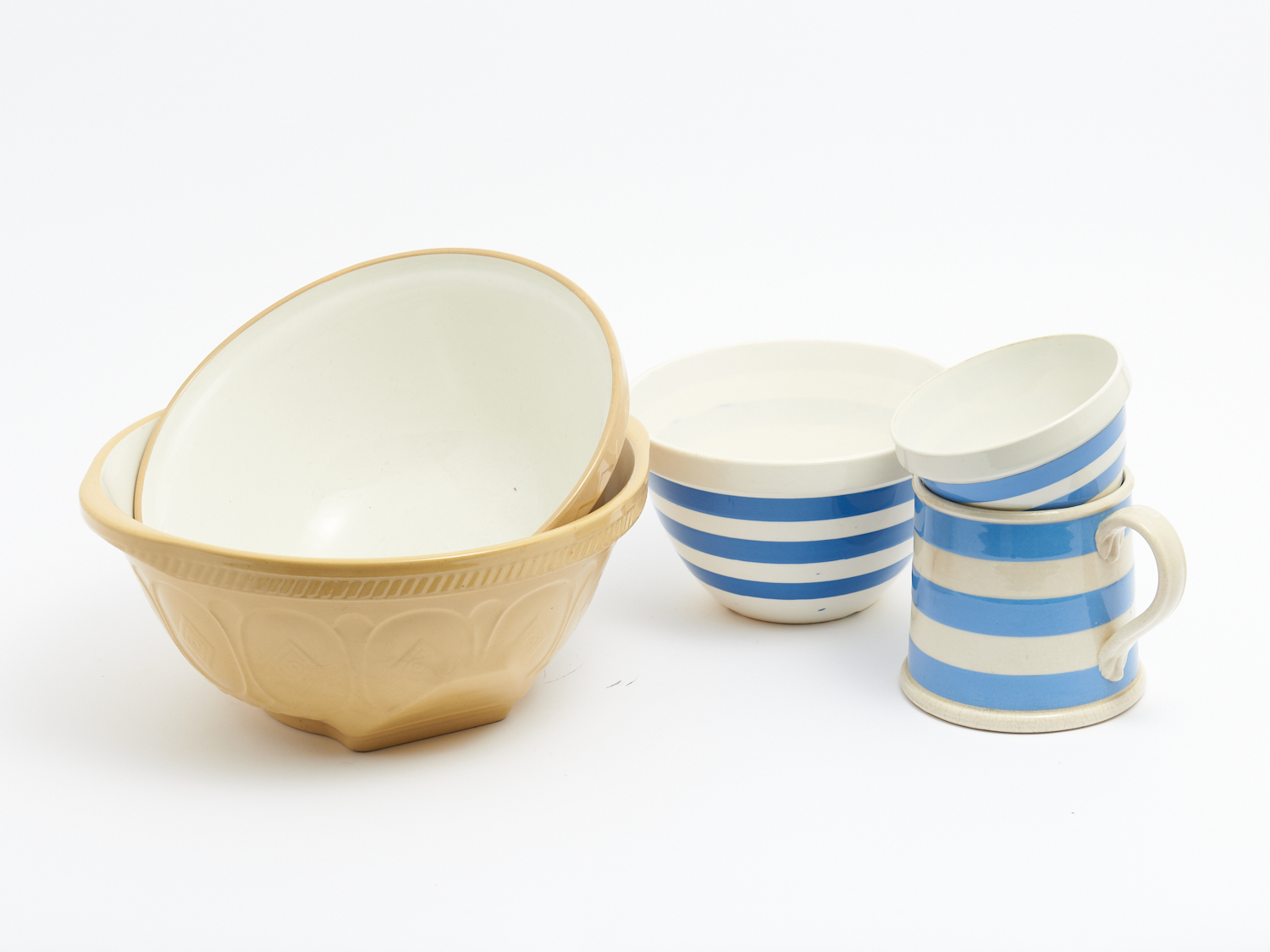 A GROUP OF ENGLISH AND AUSTRALIAN POTTERY MIXING BOWLS AND A BAKEWELLS BLUE AND WHITE STRIPED POTTERY JUG DIA.31.5CM (LARGEST), LEONARD JOEL DELIVERY SIZE: LARGE
