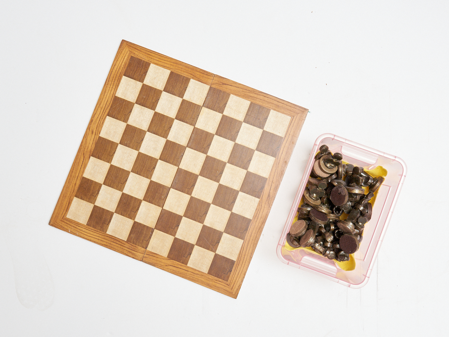 A MID-CENTURY SOLID WROUGHT IRON STEEL CHESS SET WITH FOLDING WOODEN CHESSBOARD W.45CM (CHESSBOARD), LEONARD JOEL DELIVERY SIZE: LARGE