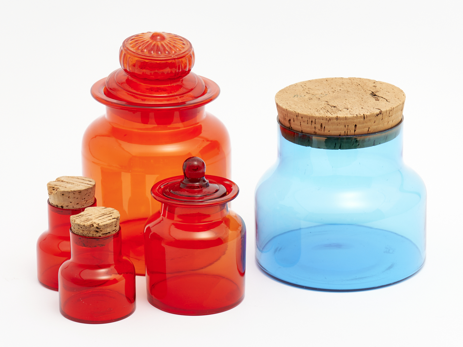 A COLLECTION OF SIX VINTAGE ITALIAN AND JAPANESE BLUE AND RED GLASS CANISTERS H.24.5CM (TALLEST), LEONARD JOEL DELIVERY SIZE: LARGE