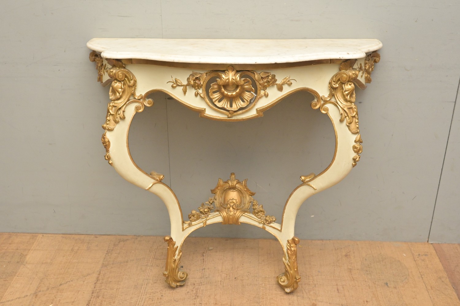 A LOUIS XV-STYLE MARBLE-TOPPED PAINTED AND GILT WOOD CONSOLE (A/F) (98H X 106W X 51D CM) (PLEASE NOTE THIS HEAVY ITEM MUST BE REMOVED BY CARRIERS AT THE CUSTOMER'S EXPENSE. LEONARD JOEL STAFF CANNOT ASSIST CARRYING THIS ITEM) (LARGE ITEM)