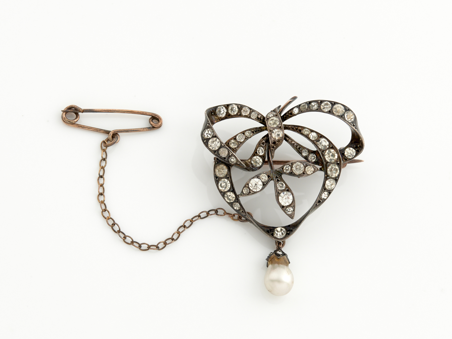 A FAUX PEARL AND PASTE SET BOW BROOCH IN SILVER, 30 X 35MM, 8.6GMS