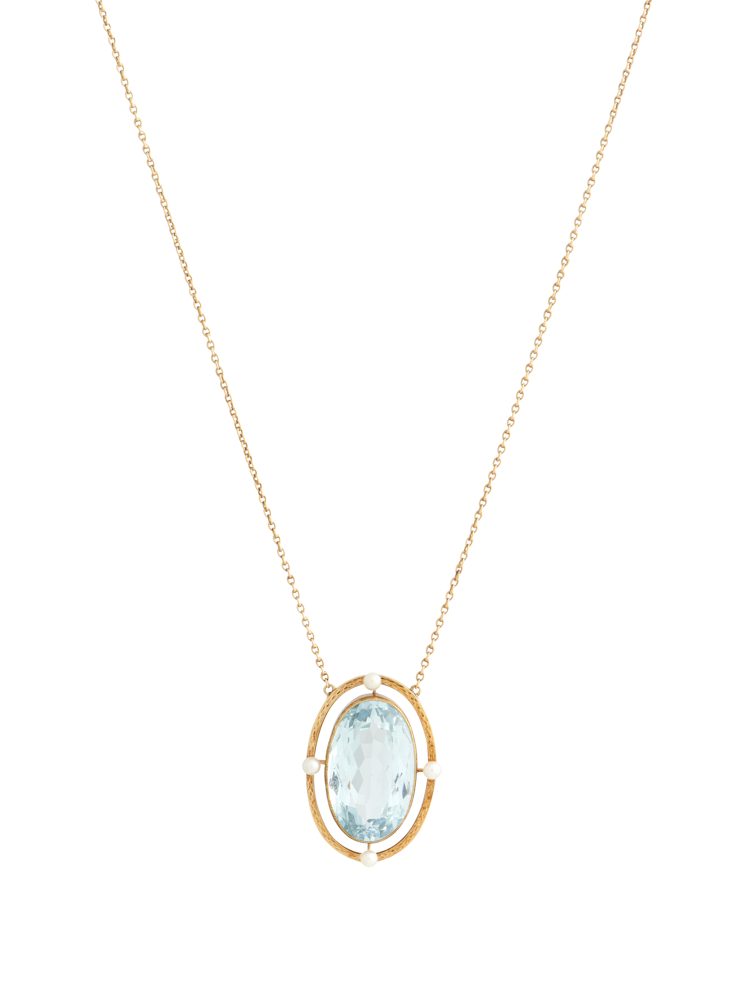 Centring a collet-set oval-shaped aquamarine weighing approximately 9.50 - 10.50 carats, within a textured frame set at intervals with seed pearls, suspended from a fine trace chain, mounted in 15ct gold, pendant length 26mm, width 18mm, chain length 450mm, gross weight approximately 6 grams.