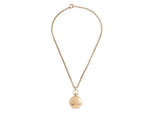 The sovereign holder is engraved to the front with initials, the reverse engraved "9.3.11", opening to reveal a sovereign dated 1878, supported by a fancy link 9ct gold chain, holder length 53mm, chain length 550mm, gross weight approximately 41 grams, Birmingham assay marks for 1903.