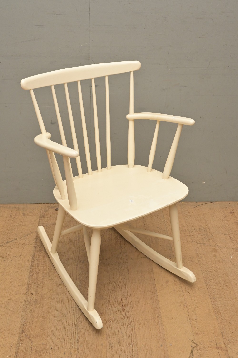 A VINTAGE WHITE PAINTED ROCKING CHAIR (A/F) (83H X 54W X 68D CM) (LEONARD JOEL DELIVERY SIZE: LARGE)