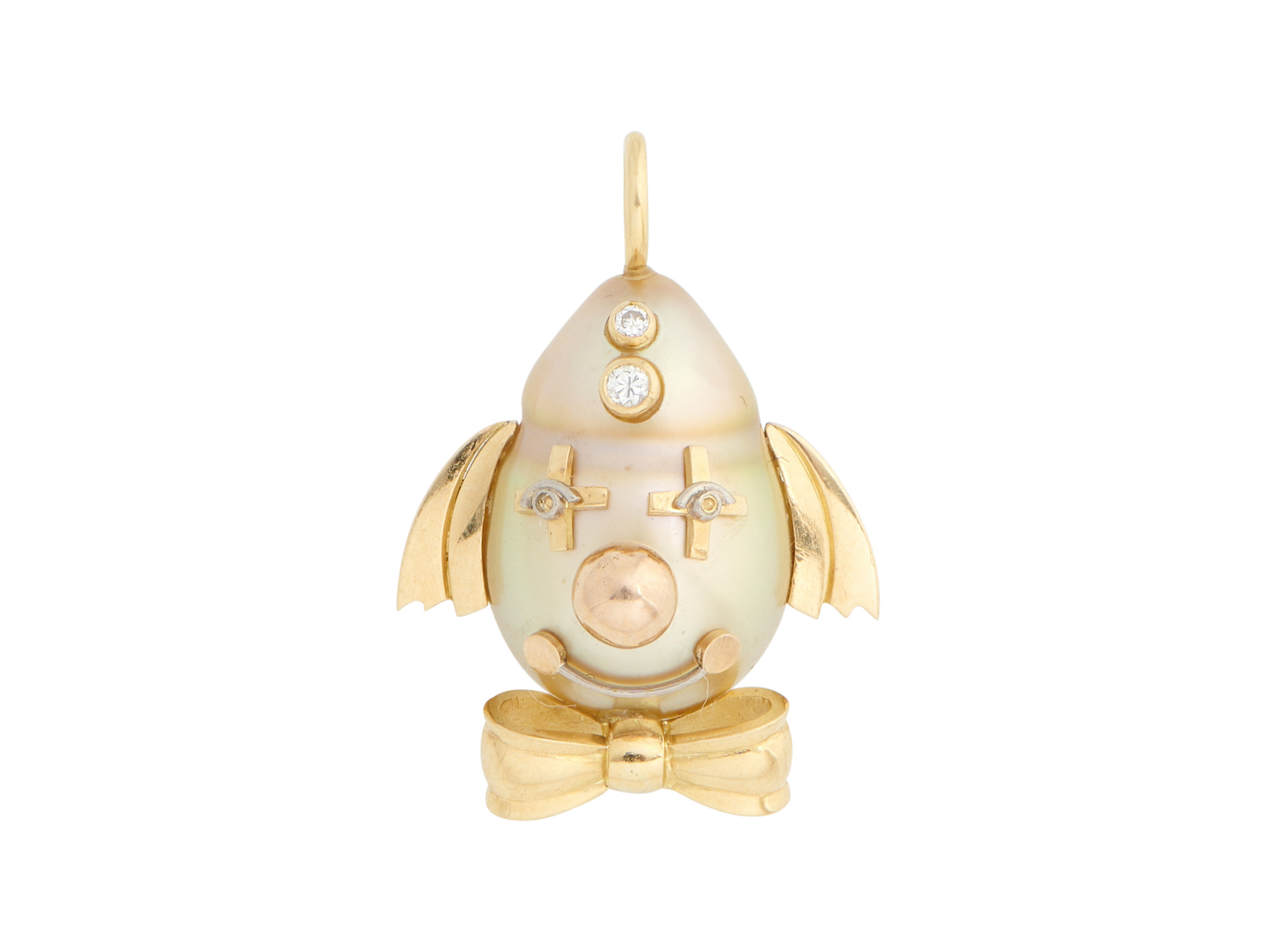 Modelled as a clown head, composed of a baroque pearl decorated with collet-set brilliant-cut diamonds, the diamonds together weighing approximately 0.03 carats, mounted in 18ct yellow and pink gold, length 24mm, gross weight approximately 4 grams.
