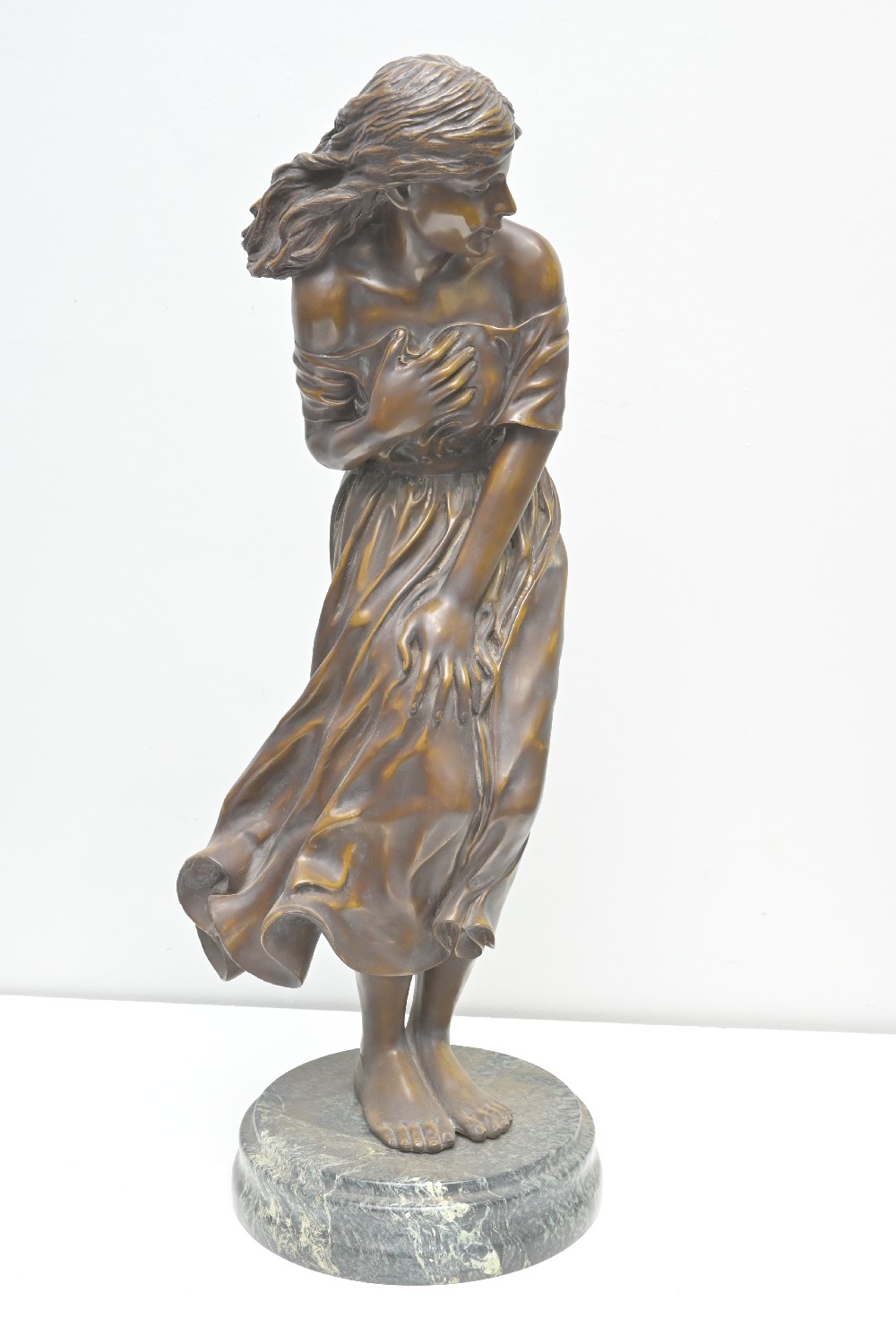 The bronze maiden is slightly loose from the marble base. There is some small areas of patina on the bronze maiden but otherwise the overall condition and appearance is good.