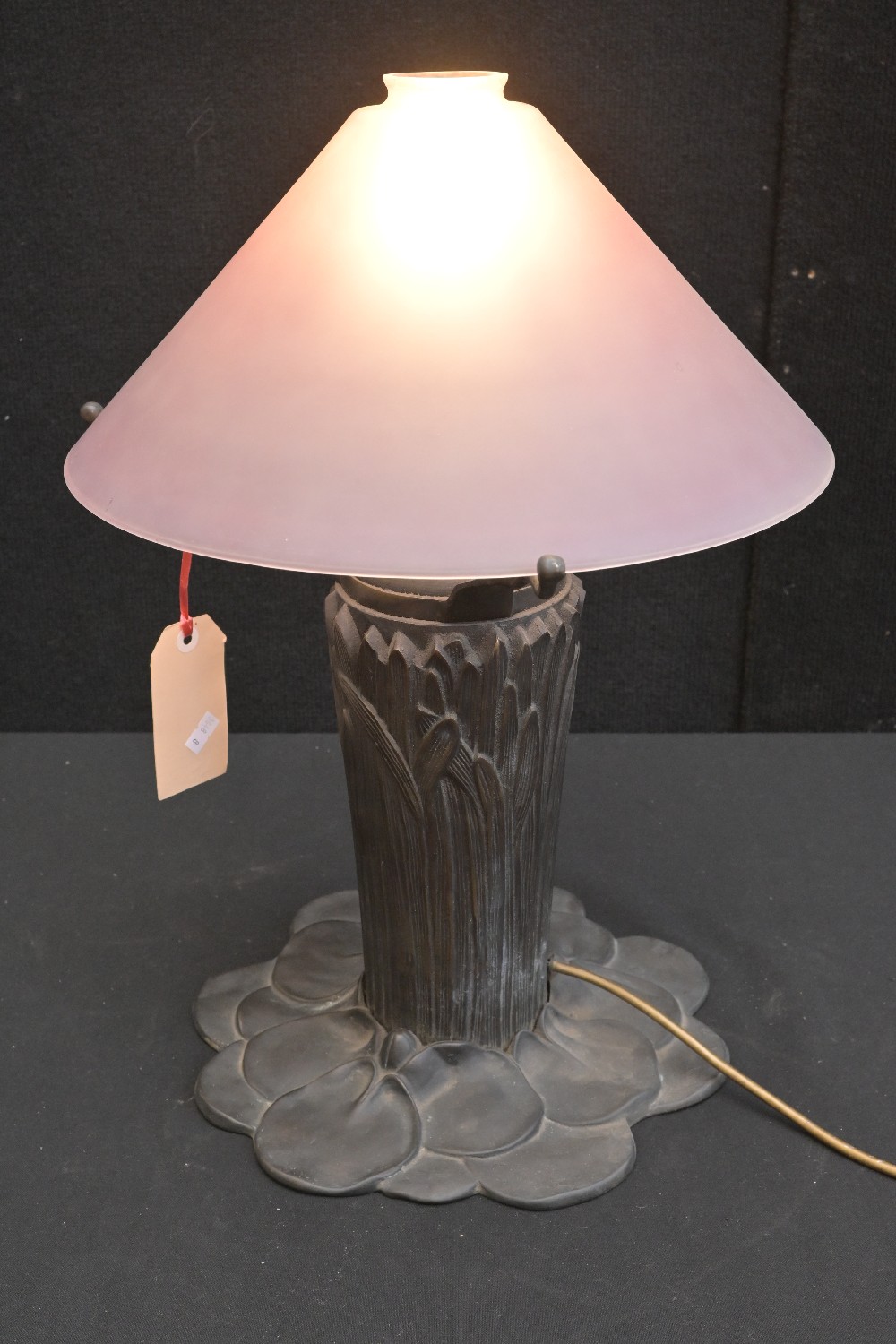 AN ART NOUVEAU STYLE LAMP WITH ASSOCIATED GLASS SHADE (A/F) (UNTESTED) (50H X 36DIA CM) (LEONARD JOEL DELIVERY SIZE: MEDIUM)