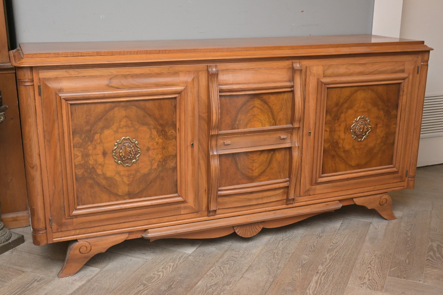 A LARGE ART DECO-STYLE FIGURED WALNUT BUFFET (A/F) (101H X 205W X 54D CM) (PLEASE NOTE THIS HEAVY ITEM MUST BE REMOVED BY CARRIERS AT THE CUSTOMER'S EXPENSE. LEONARD JOEL STAFF CANNOT ASSIST CARRYING THIS ITEM) (X-LARGE ITEM)