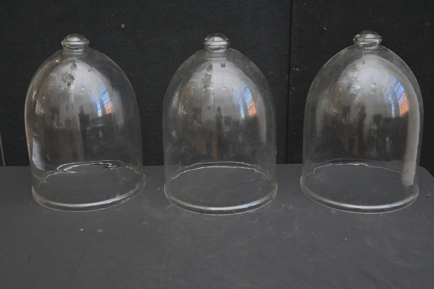 A GROUP OF THREE LARGE CLEAR GLASS HUNDI FLOAT LIGHT SHADES (A/F) (52H X 36DIA CM) LEONARD JOEL DELIVERY SIZE: LARGE)