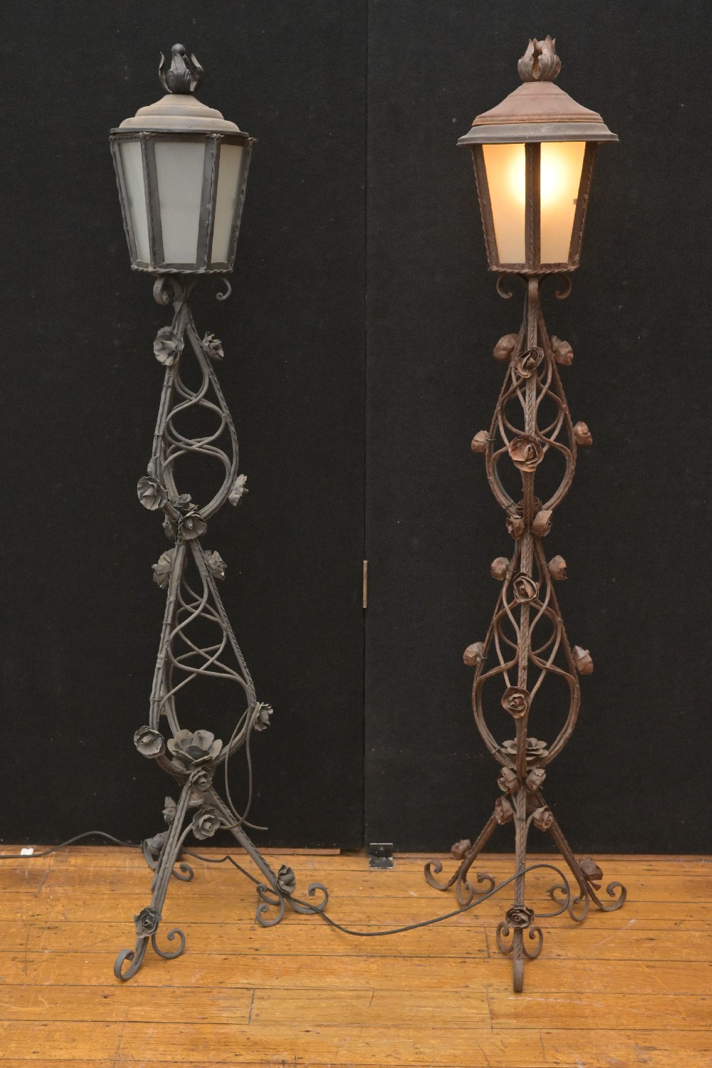 TWO SIMILAR WROUGHT IRON LANTERN FORM STANDARD LAMPS, EACH DECORATED WITH BLOSSOMING FLOWERS, PROBABLY FRENCH (A/F) (UNTESTED) (170H CM) (LEONARD JOEL DELIVERY SIZE: X-LARGE)