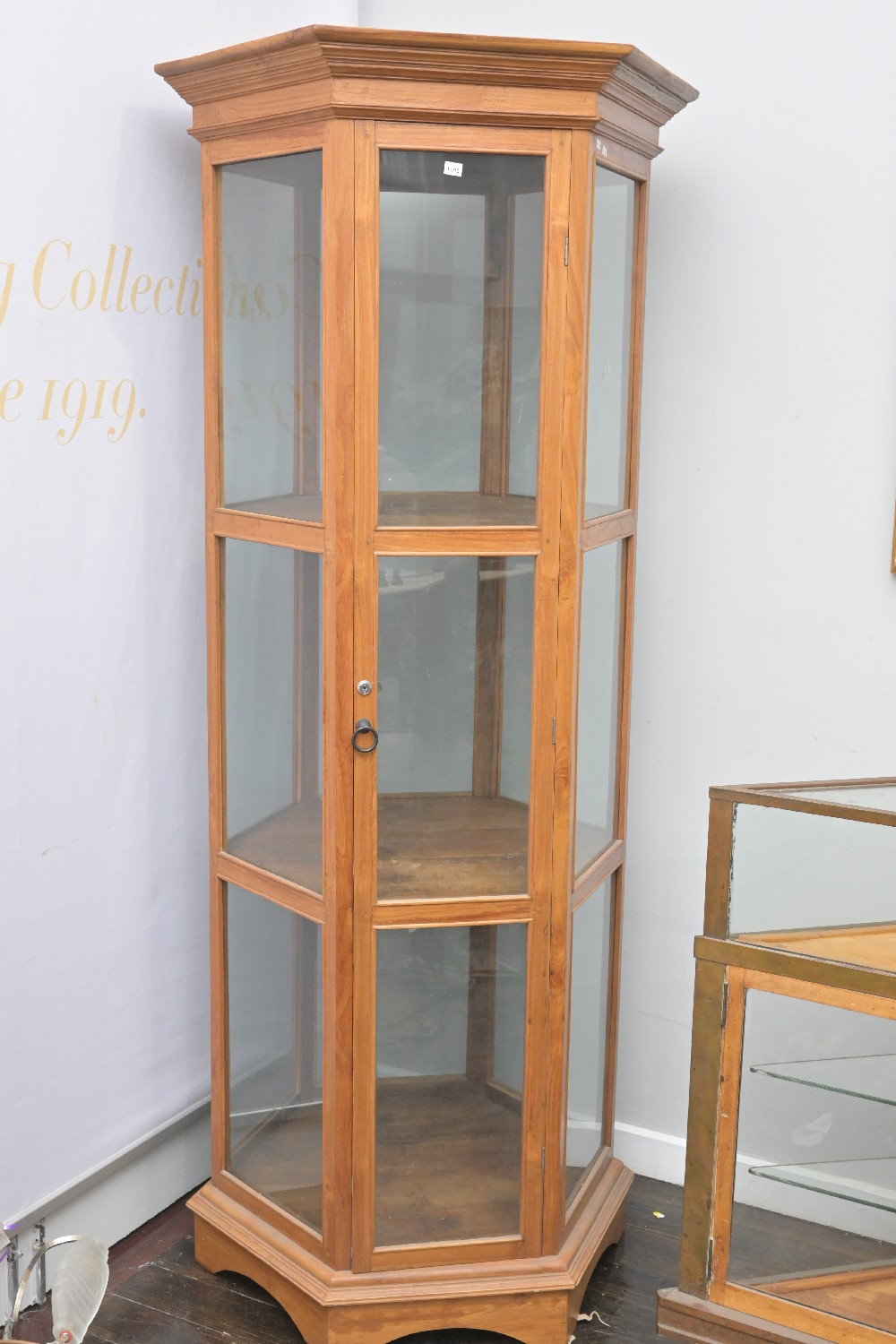 A CONTEMPORARY HEXAGONAL GLAZED DISPLAY CABINET (A/F) (200H X 87DIA CM) (PLEASE NOTE THIS HEAVY ITEM MUST BE REMOVED BY CARRIERS AT THE CUSTOMER'S EXPENSE. LEONARD JOEL STAFF CANNOT ASSIST CARRYING THIS ITEM) (X-LARGE ITEM)
