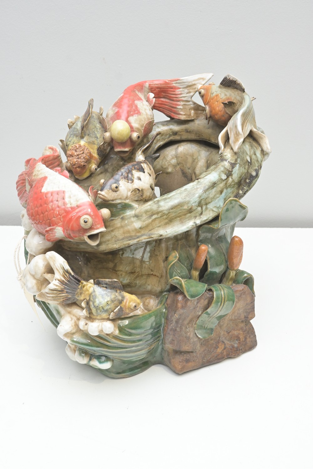A CERAMIC KOI FISH WATER FEATURE (A/F) (UNTESTED) (39H X 39W X 40D CM) (LEONARD JOEL DELIVERY SIZE: LARGE)