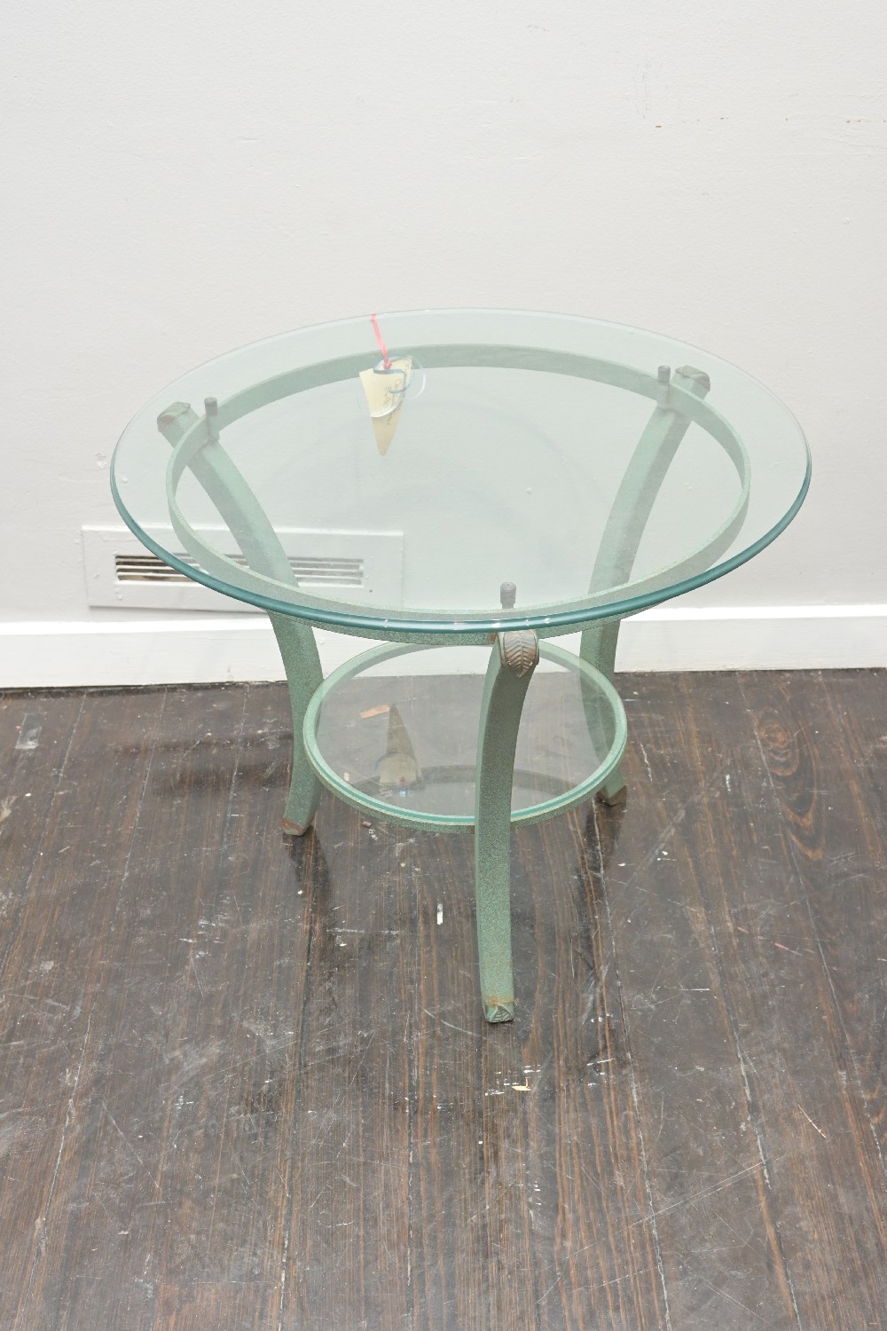 A GLASS TOP TWO TIER IRON BASE TABLE (A/F) (54H X 65DIA CM) (LEONARD JOEL DELIVERY SIZE: X-LARGE)