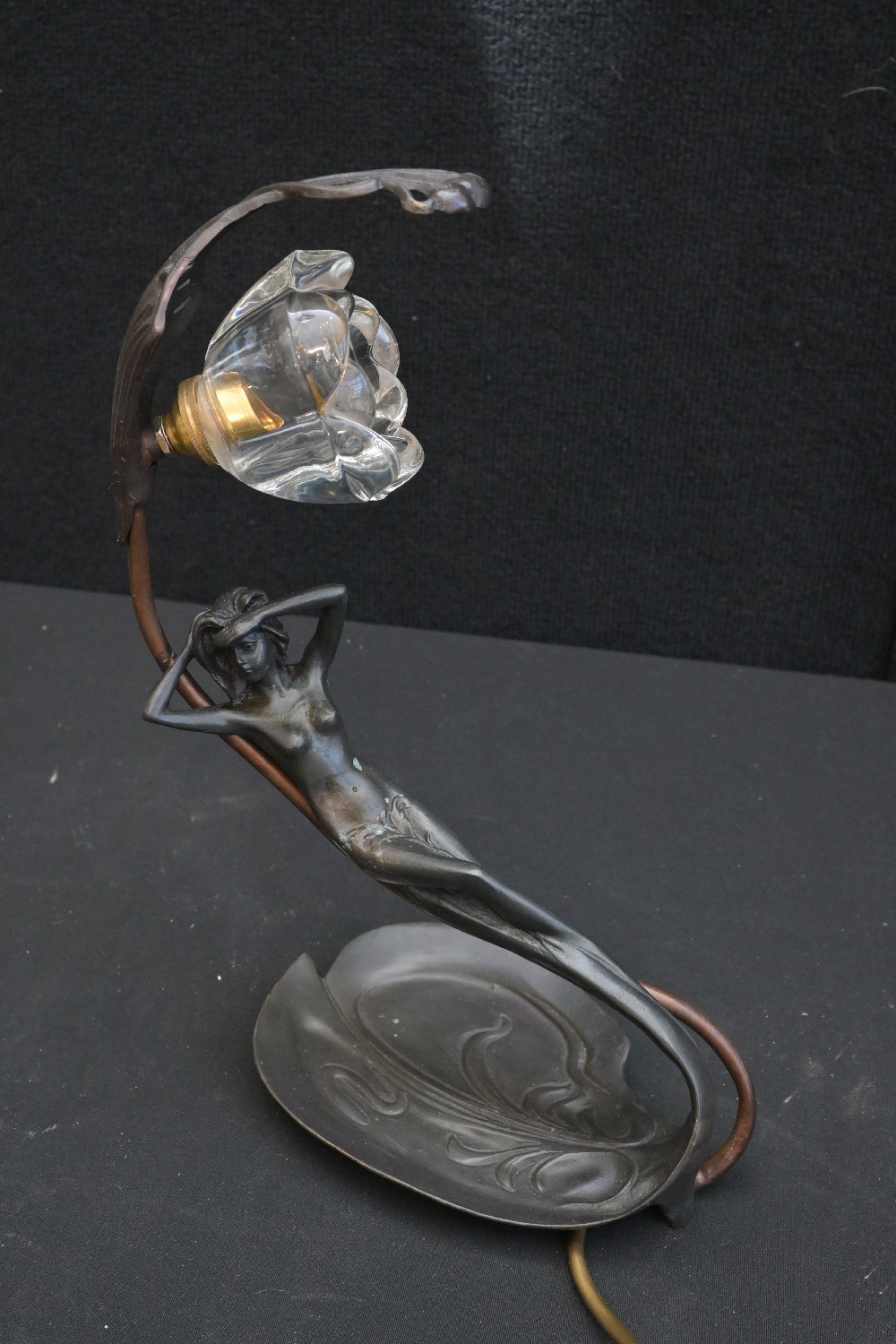 AN ART NOUVEAU STYLE FIGURAL LAMP WITH MOULDED GLASS SHADE (A/F) (UNTESTED) (37H X 21W X 14D CM) (LEONARD JOEL DELIVERY SIZE: MEDIUM)
