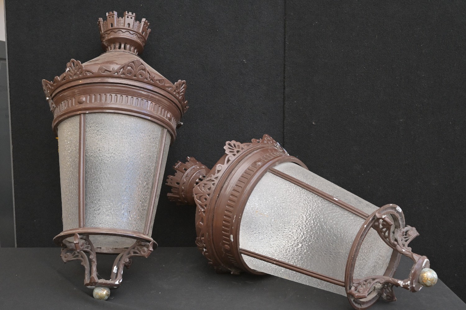 A SUBSTAINTIAL PAIR OF BROWN LANTERNS (A/F) (98H X 47DIA CM) (LEONARD JOEL DELIVERY SIZE: X-LARGE)