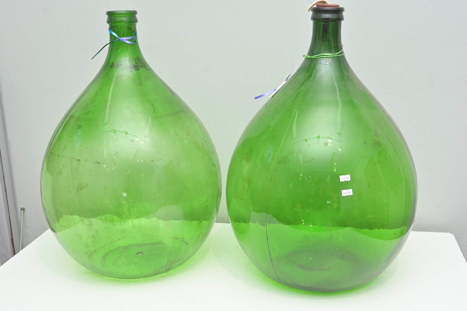 TWO GREEN GLASS DEMI-JOHNS (A/F) (66H X 40DIA CM) (LEONARD JOEL DELIVERY SIZE: LARGE)