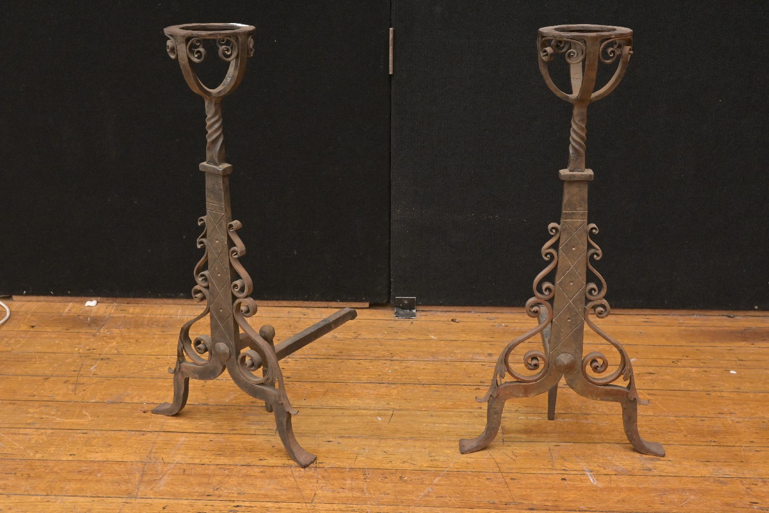 A PAIR OF ANTIQUE WROUGHT IRON ANDIRONS WITH CANDLEHOLDERS (A/F) (80H X 40W X 45D CM) (LEONARD JOEL DELIVERY SIZE: X-LARGE)