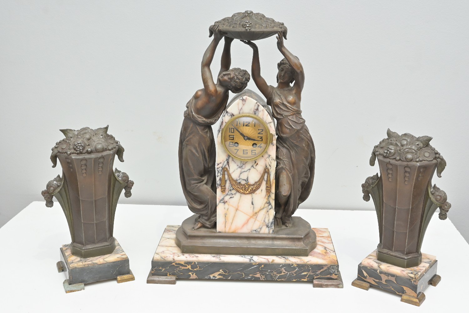 AN ART DECO MARBLE AND PATINATED SPELTER THREE PIECE CLOCK GARNITURE (A/F) (UNTESTED) (57H X 42W X 21D CM) (LEONARD JOEL DELIVERY SIZE: X-LARGE)