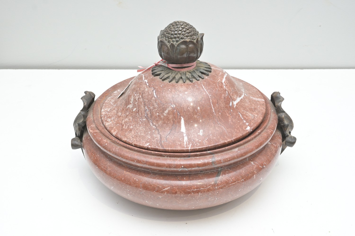 A CLASSICAL STYLE ROUGE MARBLE URN (A/F) (32H X 39DIA CM) (LEONARD JOEL DELIVERY SIZE: LARGE)