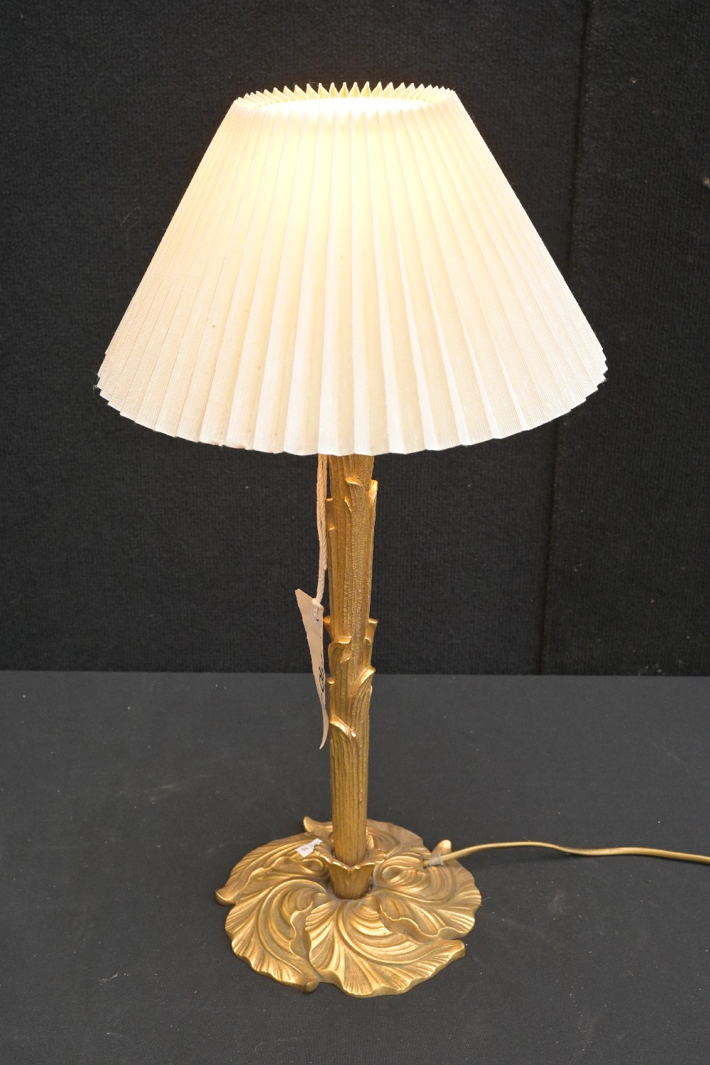 A CAST AND GILT METAL TABLE LAMP WITH PLEATED SHADE (A/F) (UNTESTED) (60H CM) (LEONARD JOEL DELIVERY SIZE: MEDIUM)