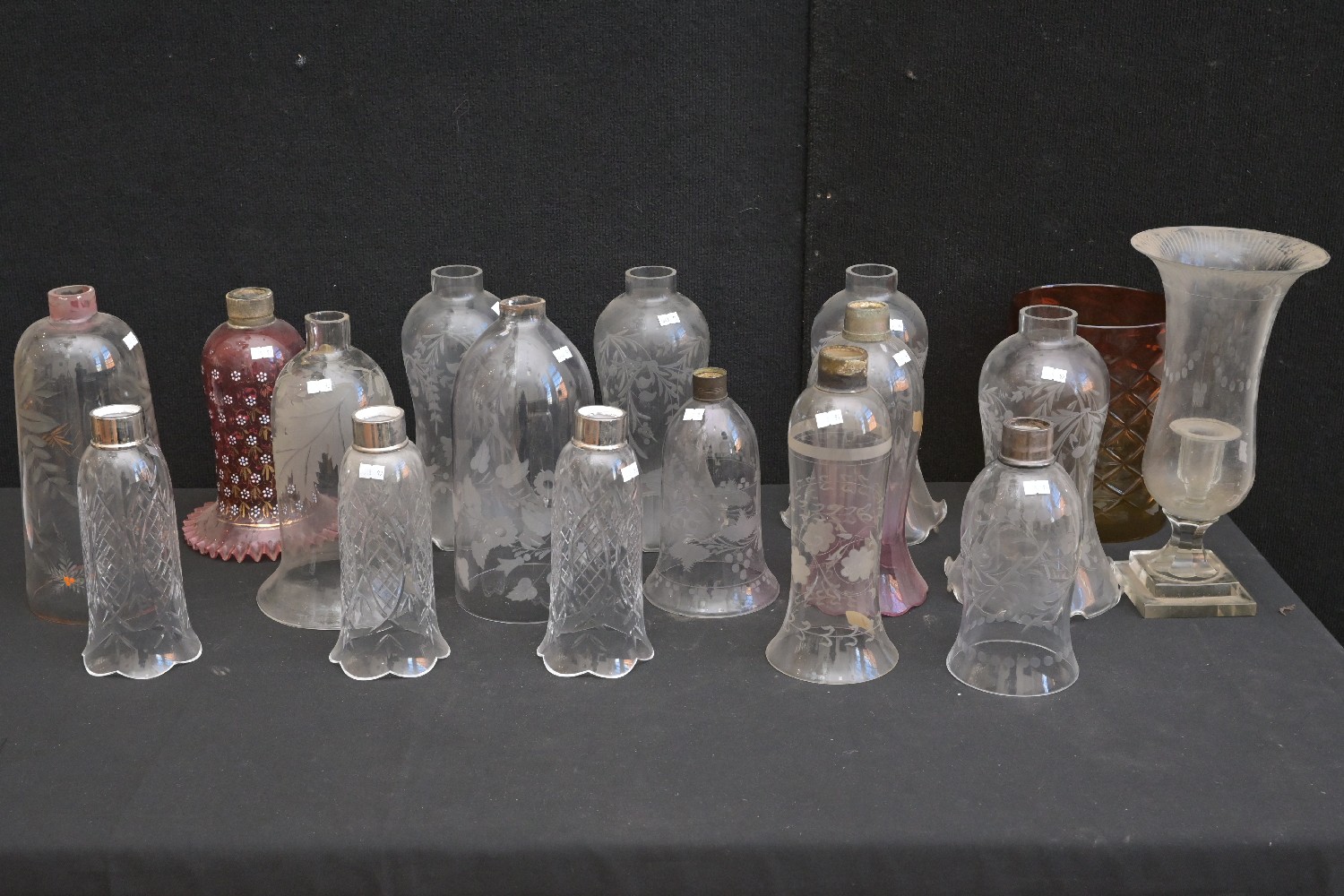 A COLLECTION OF ETCHED GLASS STORM SHADES (A/F) (35H CM) (LEONARD JOEL DELIVERY SIZE: LARGE)