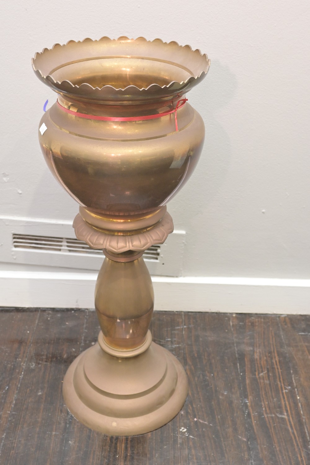 A BRASS JARDINIERE ON INTEGRAL PEDESTAL (A/F) (64H X 24DIA CM) (LEONARD JOEL DELIVERY SIZE: LARGE)
